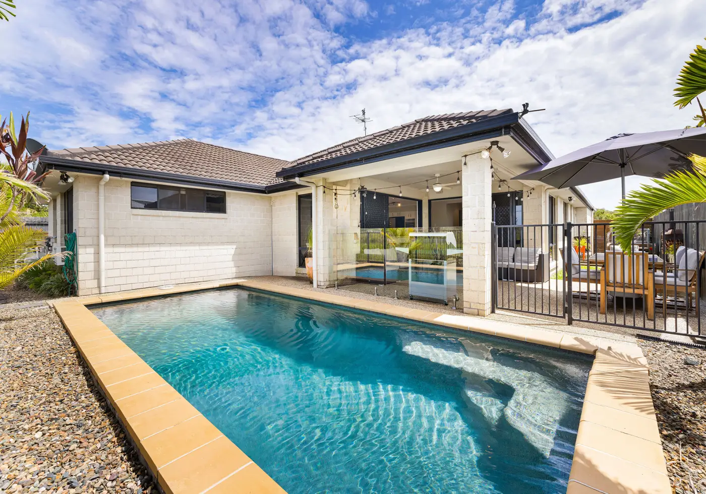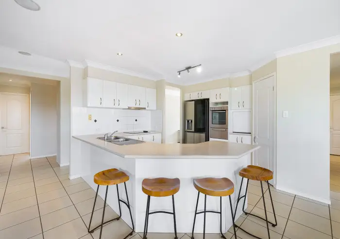 • Centrally positioned, the kitchen includes all modern conveniences, including double-fridge space, a walk-in pantry, dishwasher, breakfast bar, and plenty of storage. It flows through to the dining area and family room, both with direct access to the patio and solar-heated pool — perfect for evening BBQs with views over the reserve.